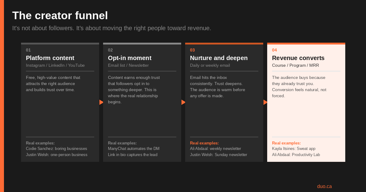 Every piece of content adds someone new to the top of the funnel. The funnel keeps converting long after the post is forgotten. That is the compounding effect. Creators who have been at it for three or four years are not working harder than they were two years ago. The machine is just processing more people than it used to.