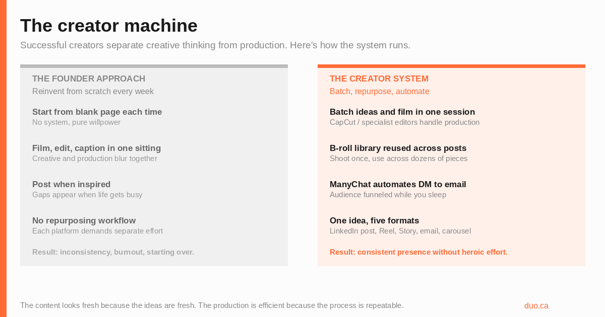 The content looks fresh because the ideas are fresh. The production is efficient because the process is repeatable.