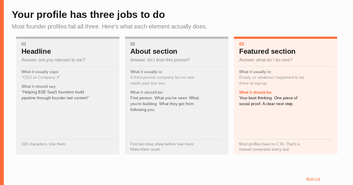 Your headline. You have 220 characters. Use them. Lead with who you help and what you do for them, not just your job title. "CEO at Company X" tells someone your org chart position. "Helping B2B SaaS founders build pipeline through founder-led content" tells them whether you're relevant to their world.