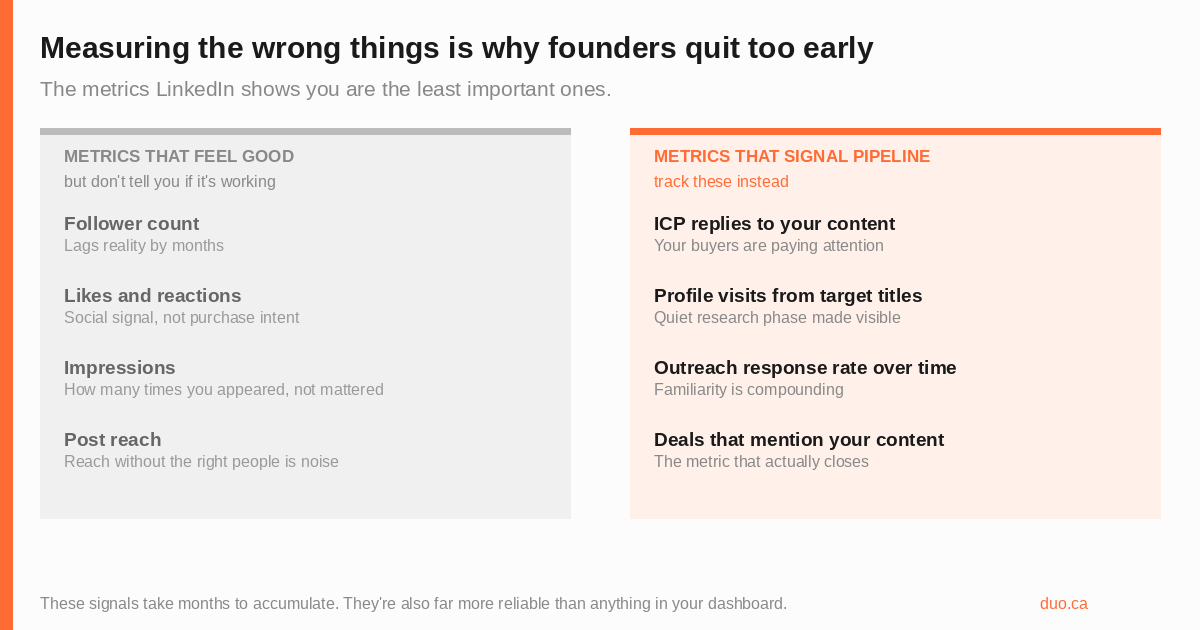 That means measuring the right things. Not likes or follower counts. Replies from people in your ICP. Profile visits from job titles that match your ideal customer. Deals that start with "I've been following your content." Those signals take time to accumulate. They are also far more reliable indicators that what you are building is working.